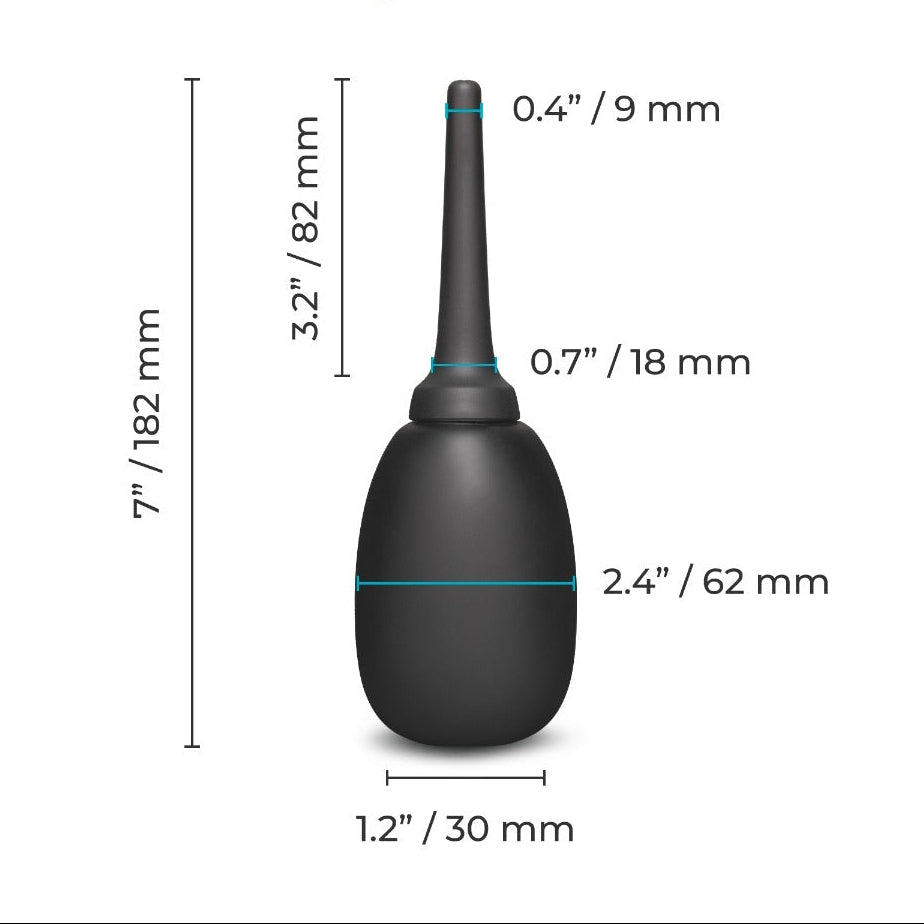Made from body-safe silicone with a metal end valve. Clean the nozzle and bulb thoroughly after each use with warm water and toy cleaner. Box includes the douche and an instruction guide.