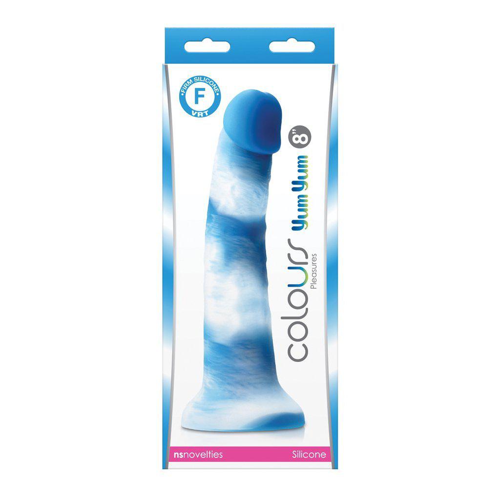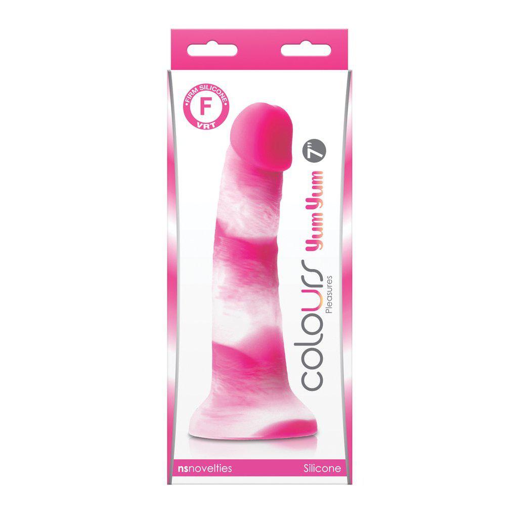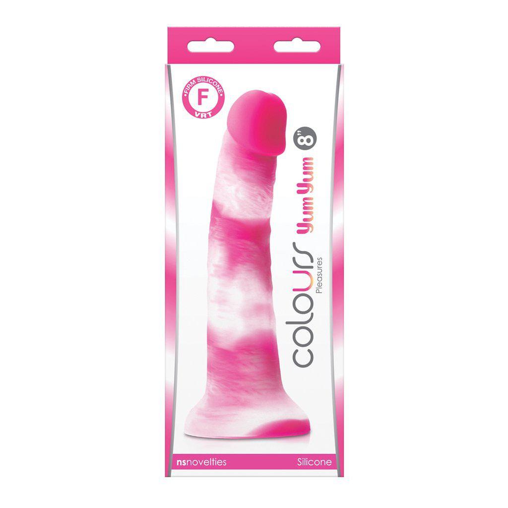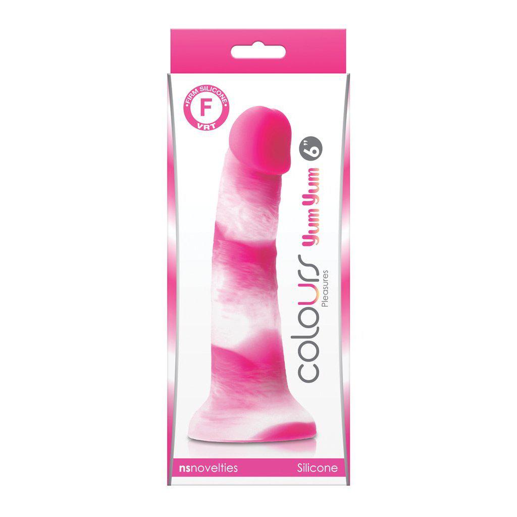Created by NS Novelties, the Colours Yum Yum dildos are made from premium body-safe silicone that feels silky-smooth against the skin. The design features a swirly pattern of colorful and white patches of silicone, creating a marble-like effect.