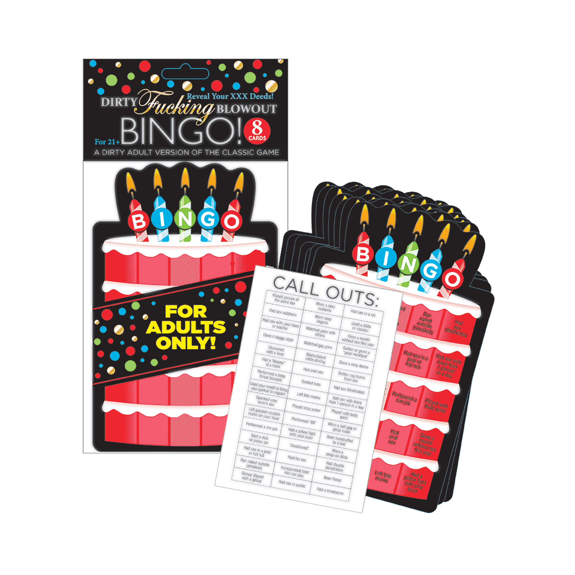 Dirty Fucking blowout bingo features eight bingo cards and one sheet of call-out actions. The party host acts as the caller of this game. If you have performed any activities on the call-out card, you can circle that action to get BINGO. This hysterical and revealing game will be a hit at your next adult-themed party. Each pack contains eight cards.