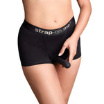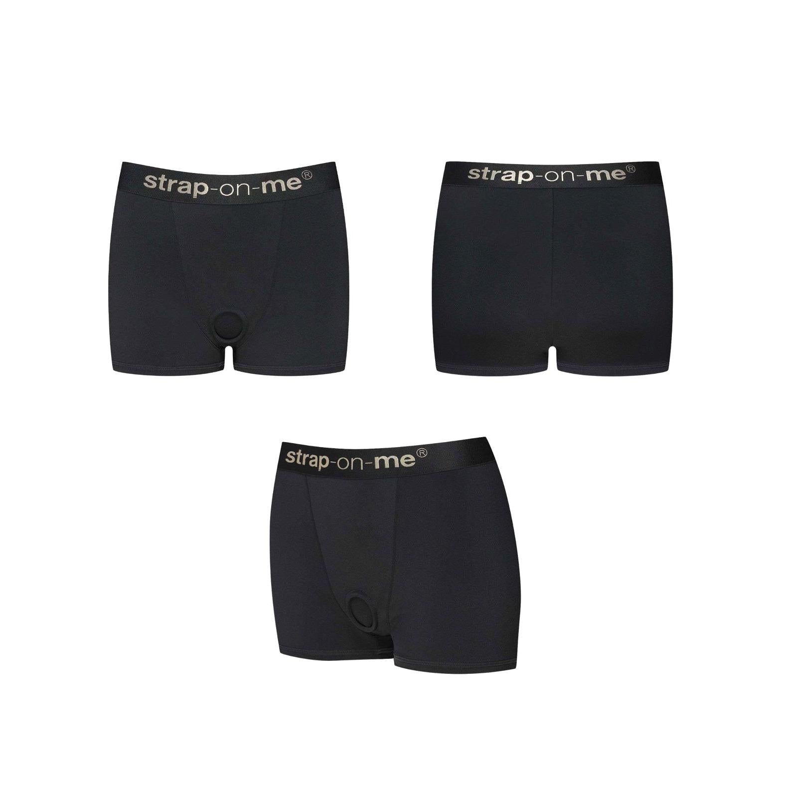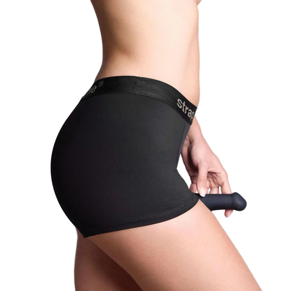 The Strap-On-Me Allure Lingerie Harness in Black is a piece of sexy lingerie built around a clean, high-waisted boxer cut that blends minimalism with confident style.